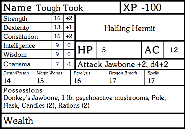 The funnel turns up all sorts of evocative characters: An Elven Ragpicker with 16 Charisma, unencumbered by any possessions except a sack of broken glass. A Dwarven Beekeeper, apparently not hampered in her chosen profession by her 4 Dexterity. Human Nobles with pet monkeys; Halfling Vintners with three jugs of wine; even Dwarven Wizard’s Apprentices.2